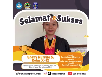 Selamat dan Sukses kepada : Ananda Ghany Nurvita S. (Kelas X-12) berhasil meraih juara : Juara II Kumite Junior 53Kg Putri, Juara III Junior