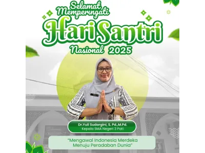 Keluarga Besar SMA Negeri 3 Pati, mengucapkan: "Selamat Hari Santri Nasional Tahun 2025." "Mengawal Indonesia Merdeka Menuju Peradaban Dunia." link youtube : https://youtu.be/w0W_nwwl5DM?si=3EYqnyYxP3oScSS2