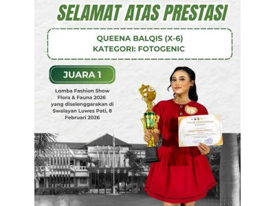 Smaga kembali berprestasi. selamat atas prestasi yang diraih kepada Ananda : QUEENA BALQIS ( X-6) KATEGORI : FOTOGENIC meraih Juara 1 Lomba Fashion