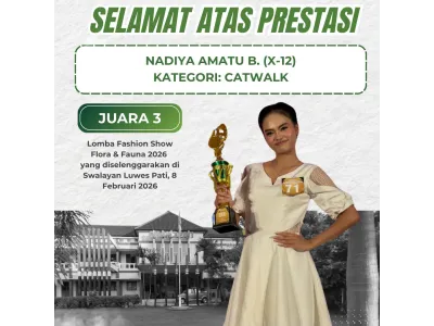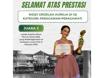 Smaga kembali berprestasi. selamat atas prestasi yang diraih kepada Ananda : RIZQY GRIZELDA AURELIA ( X-12) KATEGORI : PERAGAWAN-PERAGAWATI meraih Juara 3 Lomba