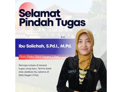 Keluarga Besar SMA Negeri 3 Pati mengucapkan : Selamat Pindah Tugas Kepada Yth. Ibu Solichah,S.Pd.I.,M.Pd. (Guru Mapel Fisika SMA Negeri 3 Pati) Terima kasih