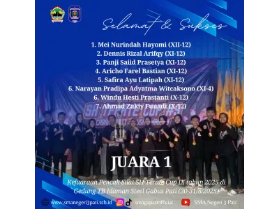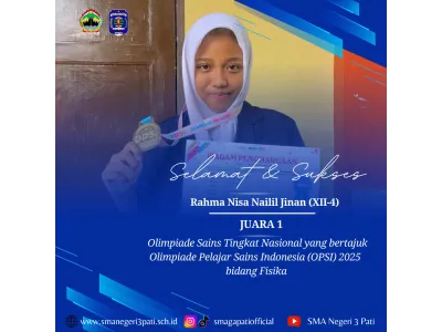Keluarga Besar SMA Negeri 3 Pati mengucapkan Selamat & Sukses kepada: Ananda Rahma Nisa Nailil Jinan ( XII-4) Berhasil meraih Juara 1 Olimpiade